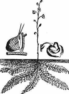 Каждая пара таких листьев дает стебелек, на оконечности которого образуется пучок подводных листьев-корней, между которыми вырастает от одного до трех, похожих на мешочки светло-зеленых шариков (рис3.19b). Шарики эти — вместилища спор, с помощью которых это растение размножается, так как сальвиния, как мы выше сказали папоротник, и папоротник корнеплодный, т. е. такой, у которого споры образуются не под листьями и не на отдельных спорангиях, а между корнями.